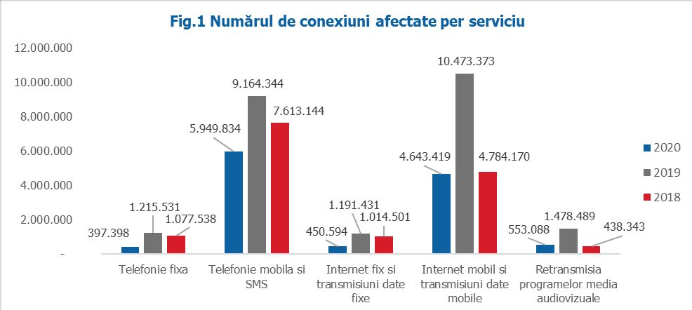 Comparativ cu ceilalți ani, în 2020 se remarcă o scădere semnificativă a numărului de conexiuni afectate în cazul serviciilor de telefonie fixă şi a serviciilor de telefonie mobilă şi SMS. De asemenea, comparând cu anul 2019, se poate observa o scădere semnificativă a numărului de conexiuni afectate în cazul tuturor serviciilor de comunicații electronice (spre exemplu: în cazul serviciului de telefonie fixă scăderea a fost cu 67%, iar în cazul serviciului de internet mobil şi transmisiuni date mobile, cu 56%).