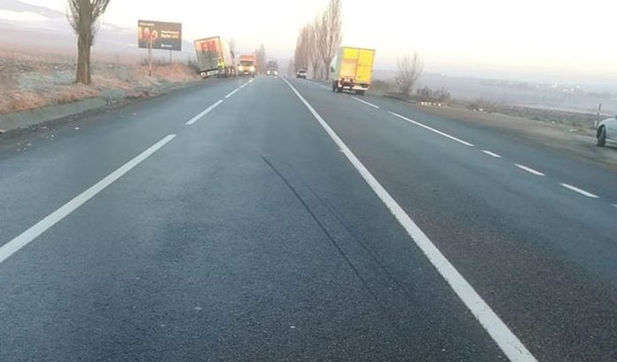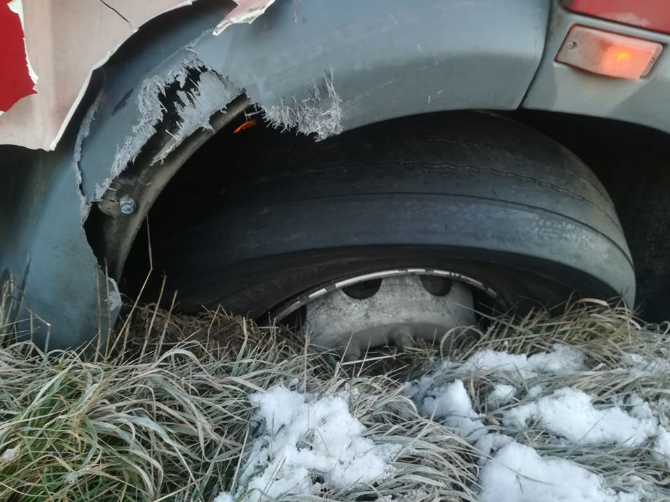 Un TIR a derapat în afara părții carosabile pe DN 2, în extravilanul localității Faraoani, județul Bacău, în urma exploziei unui pneu.