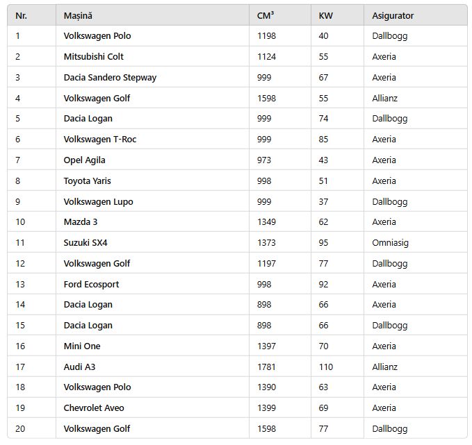 Compania de asigurare: Axeria și Dallbogg domină clasamentul, oferind cele mai ieftine polițe pentru majoritatea modelelor de mașini din top.
