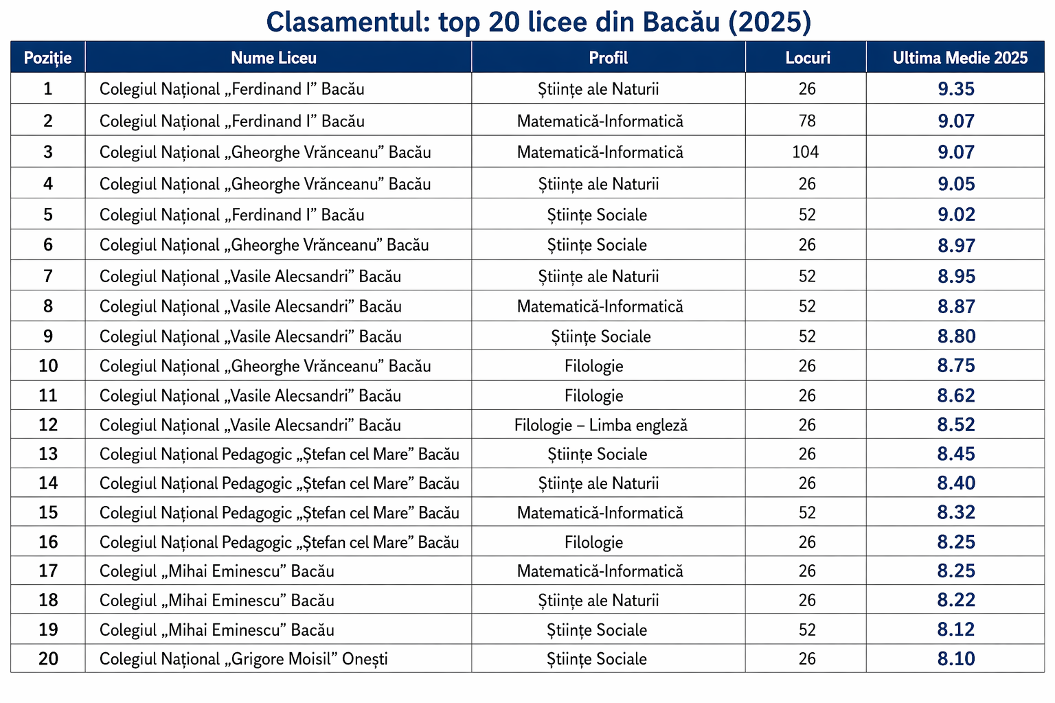 Ultima medie de admitere în topul liceelor din Bacău pentru anul școlar 2025-2026 variază între 9,35, la profilul Științe ale Naturii de la Colegiul Național „Ferdinand I”, și aproximativ 8,10 pentru liceele situate spre finalul topului.