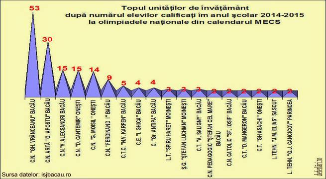 Conform datelor furnizate pe site-ul isjbacau.ro, s-a realizat un Top al unitatilor de invatamânt dupa numarul elevilor calificati in anul scolar in curs la olimpiadele nationale.