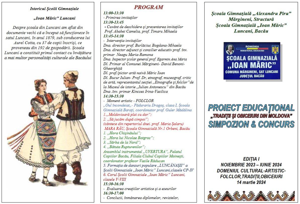 La Școala Gimnazială „Ioan Măric” din Luncani (comuna Mărgineni) are loc astăzi, 14 martie, un simpozion și un concurs de creații artistice și literare pentru elevi, cu tema „Tradiții și obiceiuri din Moldova”, dar și prezentarea unei reviste cu același titlu. Manifestarea face parte din prima ediție a unui proiect cultural, artistic, de folclor, de tradiții și de obiceiuri populare, derulat în perioada noiembrie 2023 – iunie 2024.