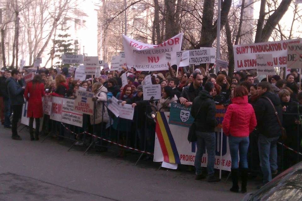 Circa 250 de traducatori din intreaga tara au protestat, vineri, la Bucuresti, in fata Ministerului Justitiei, impotriva proiectului de lege prin care se incearca ingradirea drepturilor traducatorilor si impunerea unor taxe si obligatii greu de acceptat.