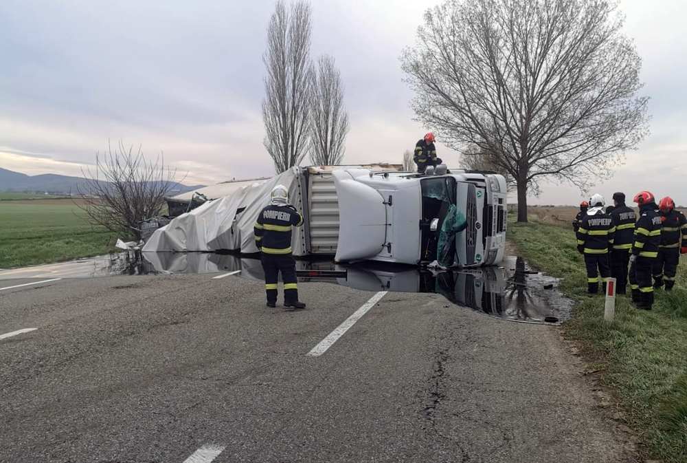 Autocamionul, înmatriculat în Bulgaria, transporta 14 containere din PVC încărcate cu melasă, o substanță vâscoasă rezultată din procesul de rafinare a zahărului. O parte din încărcătură s-a deversat pe carosabil, îngreunând considerabil intervenția și blocând complet circulația pe ambele sensuri de mers.