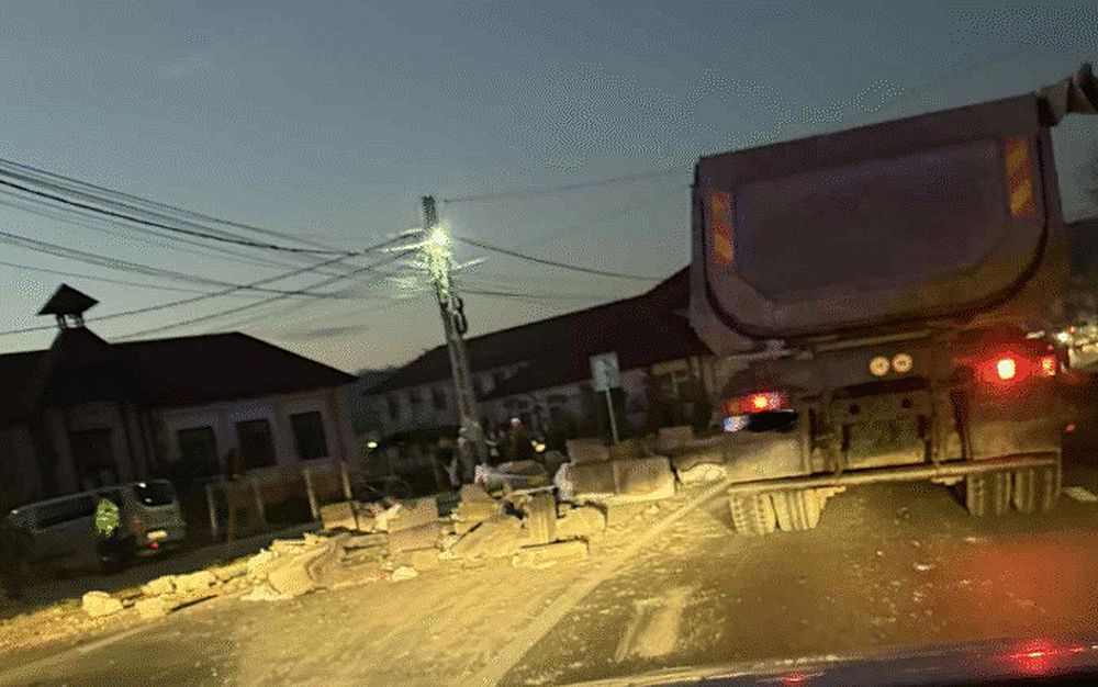 Potrivit martorilor, inițial s-a crezut că este vorba despre bolțari, însă materialele de construcție împrăștiate pe carosabil s-au dovedit a fi rigole pentru poduri, informează unupetrotus.ro.