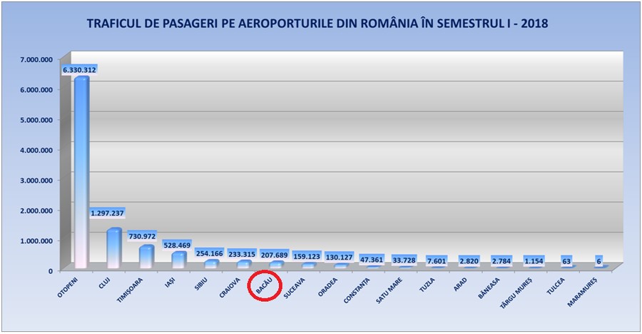 Numărul pasagerilor pe Aeroportul Internațional „George Enescu” din Bacău la sfârșitul primului semestru a ajuns la aproape 208.000 de persoane. Cifra menține aeroportul băcăuan pe locul al șaptelea în topul național, după aeroporturile Otopeni, Cluj-Napoca, Timișoara, Iași, Sibiu și Craiova. Comparativ cu Aeroportul din Iași, cel din Bacău a ajuns abia la jumătatea numărului de pasageri. România are 17 aeroporturi civile.