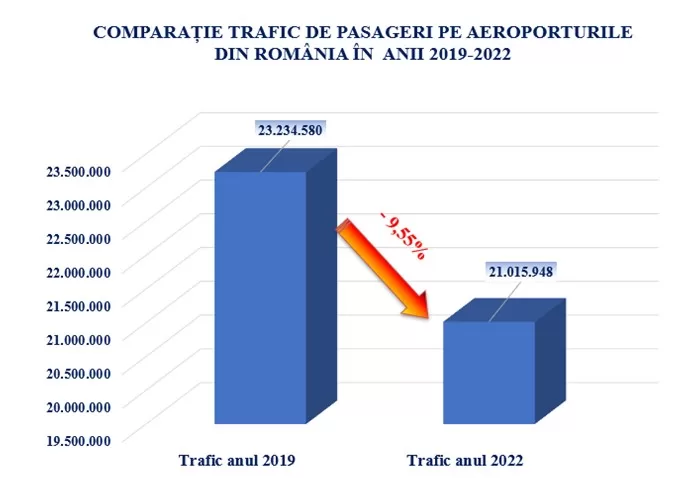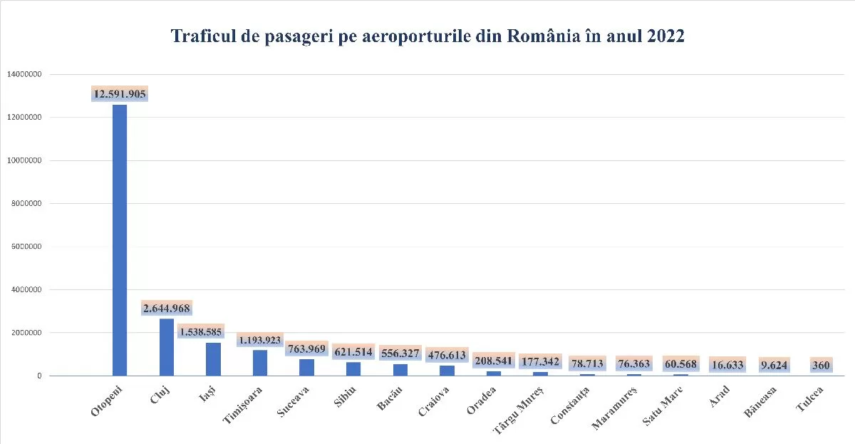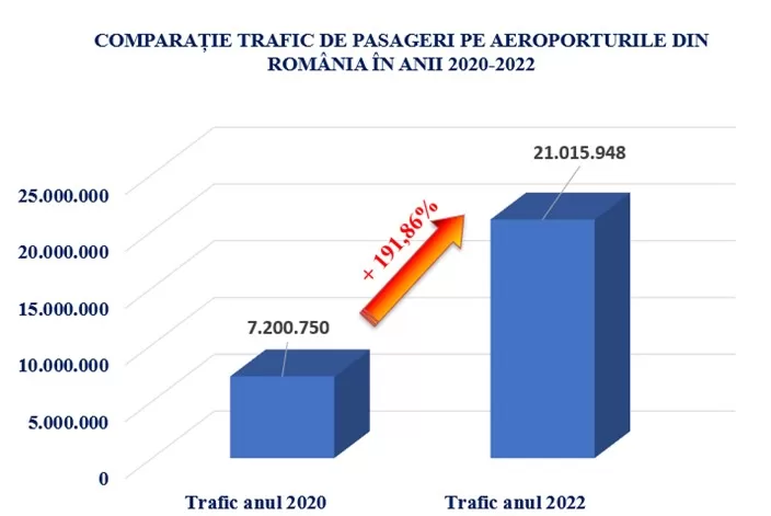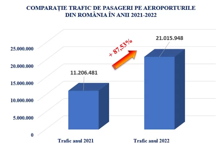 Peste 21 de milioane de pasageri au tranzitat aeroporturile românești anul trecut, cu 87% mai mulți decât în anul 2021. Raportată la anul 2020, valoarea înregistrată în 2022 (21.015.948 pasageri) este cu aproape 192% mai mare. Chiar dacă numărul total al pasagerilor de anul trecut este cu 9,55 procente sub nivelul maxim înregistrat înainte de pandemie (anul 2019), el depășește până și cele mai optimiste scenarii de trafic care au fost estimate pentru anul trecut, ceea ce înseamnă că aviația comercială din România a recuperat mai rapid decât așteptările pieței pierderile din anii de pandemie.