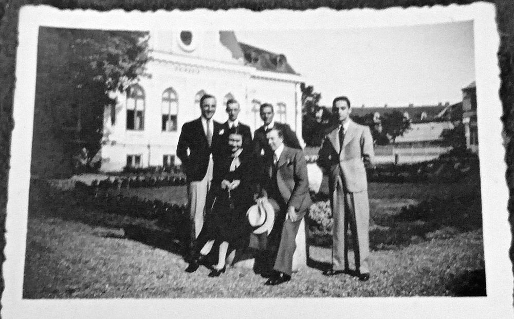 Prima fotografie, realizată în fața clădirii Primăriei Bacău, surprinde un grup elegant de tineri – bărbați în costume croite impecabil și o doamnă în ținută sobră, ținând o pălărie în mâini. Fațada inconfundabilă a vechii Primării, cu ferestrele sale arcuite și decorul neoclasic, se profilează în fundal. Atmosfera pare una de după-amiază însorită, poate la ieșirea dintr-un eveniment cultural sau universitar. Privirile lor degajate, zâmbetele discrete și eleganța vestimentară redau o perioadă de optimism și rafinament urban – scurtă, dar intensă, înainte ca războiul să schimbe totul.