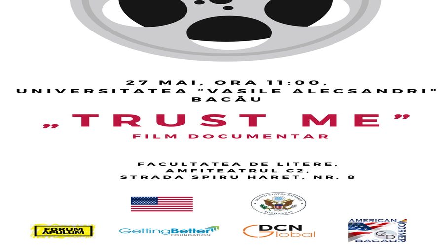 Ambasada SUA și Centrul ”American Corner Bacău” vă invită vineri, 27 mai, începând cu ora 11.00, la proiecția filmului documentar „Trust Me!”, în regia lui Roko Belic (Președintele Wadi Rum Films), producător executiv Joe Phelps (CEO-ul Getting Better Foundation).