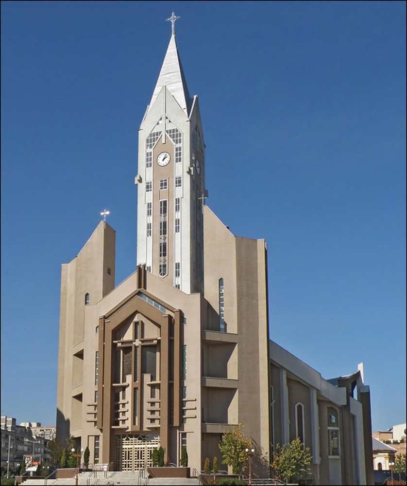 Este o construcţie frumoasă ce domină centrul Bacăului prin măreţia şi înălţimea sa. Biserica a fost sfinţită la 20 noiembrie 2005 de Preasfinţitul Petru Gherghel, episcop de Iaşi. Ea are o formă neconvenţională de 66×44, iar înălţimea de 70 m cu o suprafaţă utilă de 1.300 mp şi cu 1.050 locuri pe scaune; 52 m lungime, 44 m lăţime, 77 m înălţime, cu tot cu crucea din turn. Are două etaje, cu o cupolă imensă ce dă o strălucire deosebită interiorului bisericii, fără nici un stâlp central de susţinere.