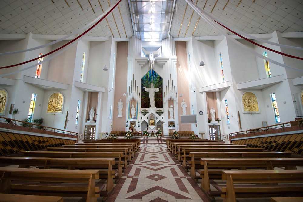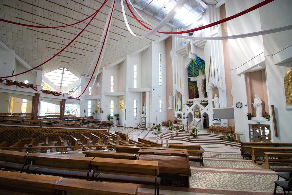 Altarul bisericii este încadrat în semicerc de un grup statuar format din şapte sfinţi, centrală fiind statuia lui Iisus Christos, care depășește înălțimea de 2, 5 metri. Cele trei clopote ale catedralei au fost realizate cu instalații electronice și au fost turnate în Padova (Italia). Central, pe turla bisericii, la circa 65 m s-a montat un imens ceas electronic, care din sfert în sfert de oră dă semnalul trecerii timpului din viața noastră.