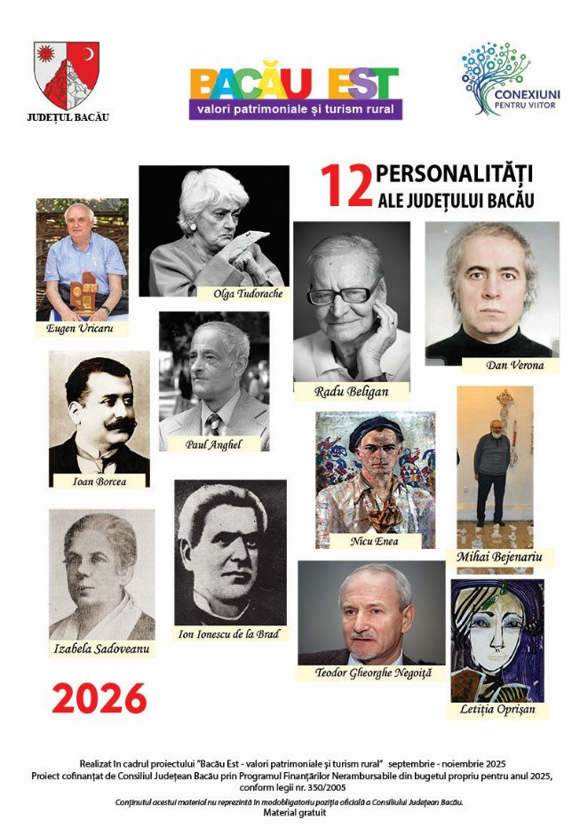 Calendarul celor 12 personalități, în afara aducerii în atenție a acestor nume de referință a culturii băcăuane, se dorește a fi un stimul pentru descoperirea altor trasee turistice, spre locurile în care s-au născut aceste personalități, altele decât cele trei documentate în cadrul proiectului. „BACĂU EST – valori patrimoniale și turism rural” a realizat trei broșuri de promovare a traseelor cultural turistice Bacău-Stănișești (locul de naștere al lui George Apostu), Bacău –Horgești (cu figura spirituală a părintelui Constantin Galeriu) și Bacău- Huruiești (unde a vazut lumina zilei, istoricul Vasile Pârvan).