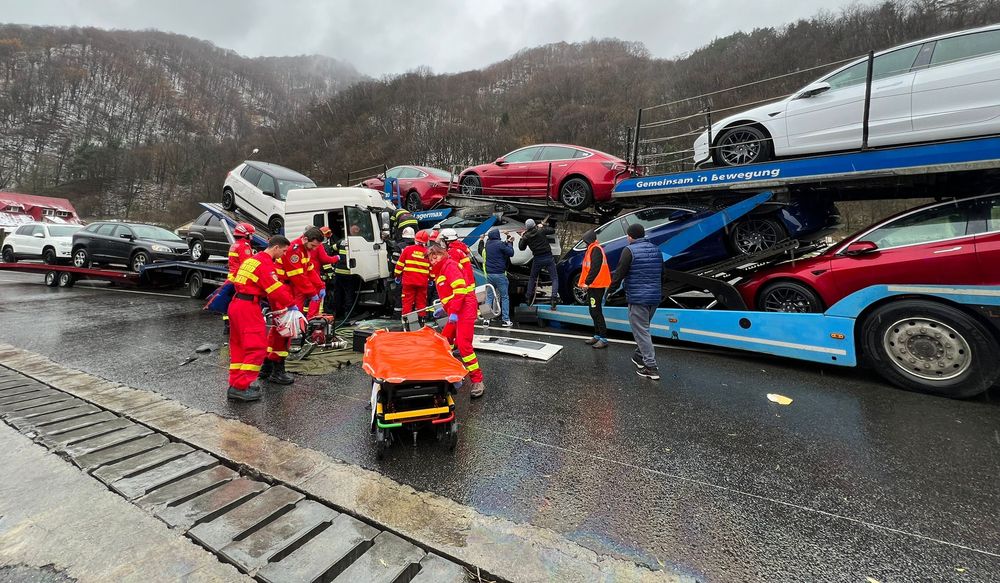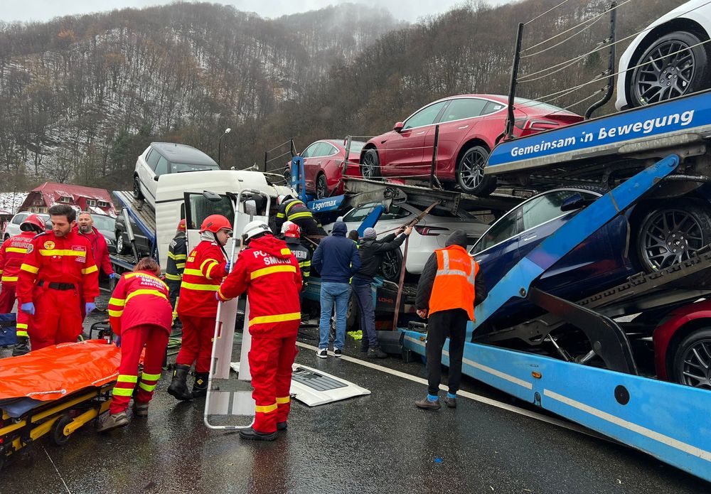 Pagube de zeci de mii de euro, azi, după ce o platformă încărcată cu mașini Tesla nou-nouțe s-a ciocnit, pe Valea Oltului, cu o platformă încărcată cu autoturisme second-hand.