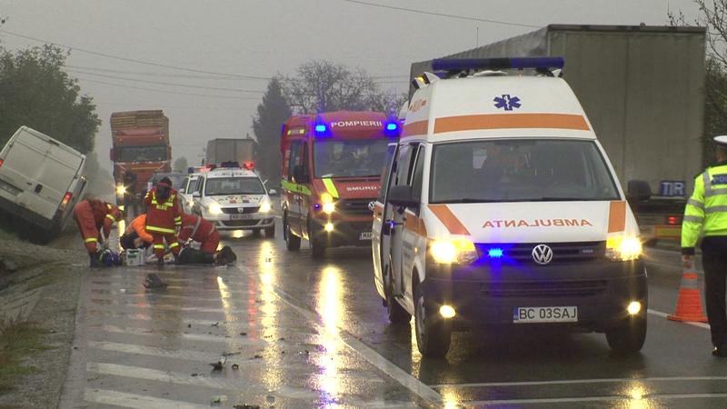 Evenimentul rutier s-a petrecut joi dimineata, pe drumul european 85, in localitatea Cleja. Un sofer grabit, aflat la volanul unui microbuz, a izbit un grup de pietoni chiar pe zebra.
