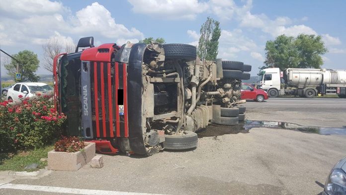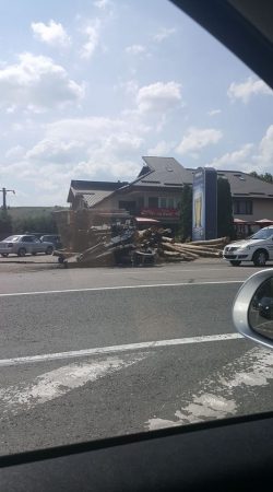 În urma manevrei de viraj a pierdut controlul asupra volanului şi s-a răsturnat. Încărcătura s-a împrăştiat pe carosabil iar bucăţi de lemn au lovit o maşină parcată, care a fost avariată.