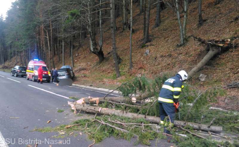 Potrivit Inspectoratului de Poliție Județean Bistrița-Năsăud, mașina, condusă de un bărbat în vârstă de 47 de ani din județul Bacău, a fost grav avariată în urma căderii unui copac pe șosea, în apropierea localității Mureșenii Bârgăului.