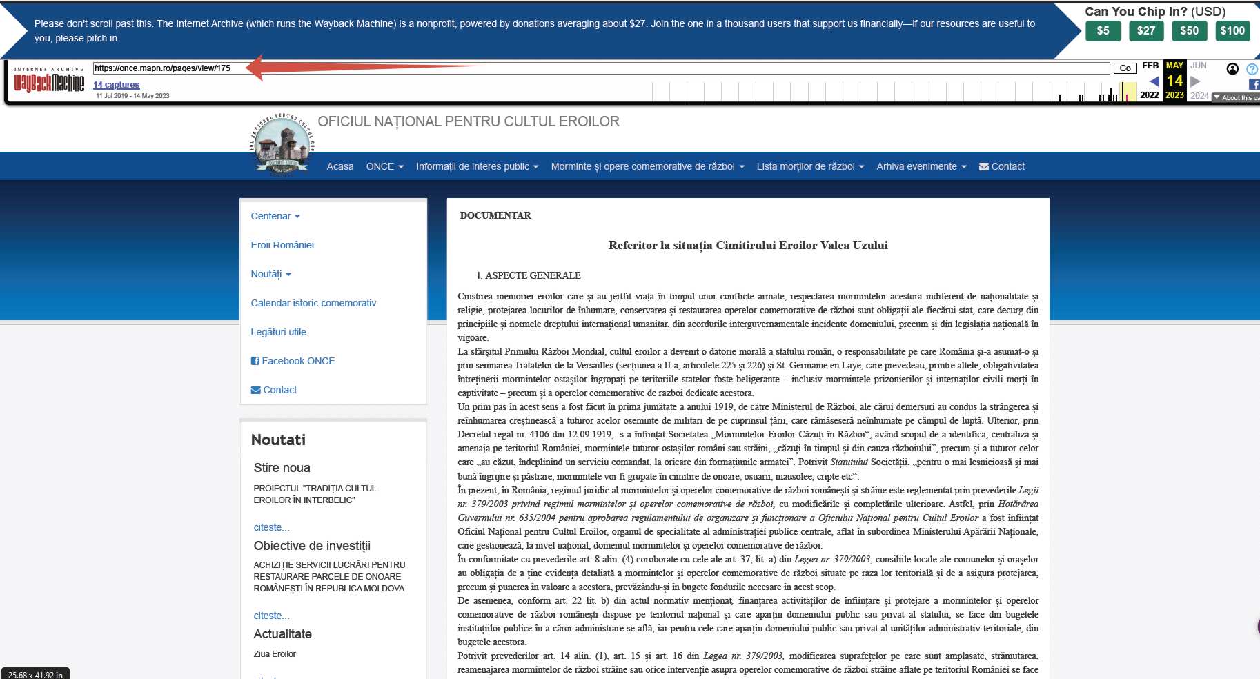 Un material documentar important al Oficiului Național pentru Cultul Eroilor (ONCE) a dispărut de pe site-ul instituției, după pronunțarea sentinței în cazul Valea Uzului. Potrivit informațiilor obținute de la arhiva site-ului web Archive.org, documentul a fost eliminat după data de 15 mai.