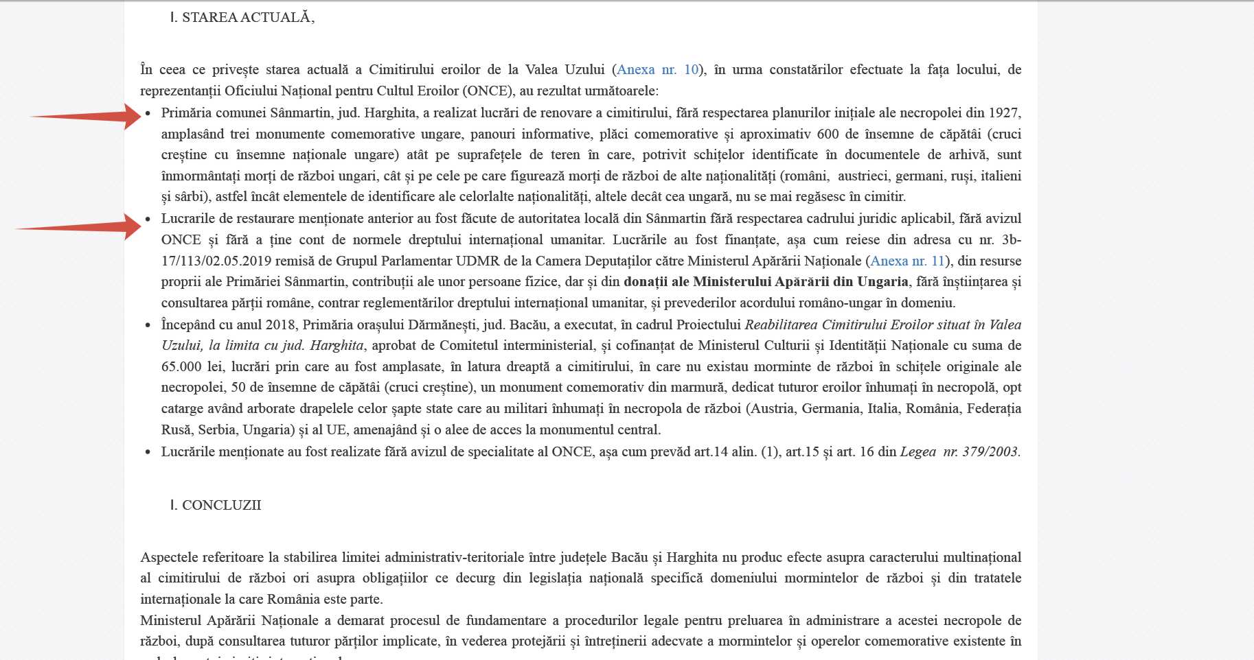 Materialul documentar în cauză conținea declarații emise de ONCE cu privire la realizarea unor lucrări de renovare a cimitirului din comuna Sânmartin. Conform ONCE, aceste lucrări nu au respectat planurile inițiale ale necropolei, iar crucile destinate soldaților maghiari au fost instalate fără avizul instituției și fără a se respecta cadrul juridic.