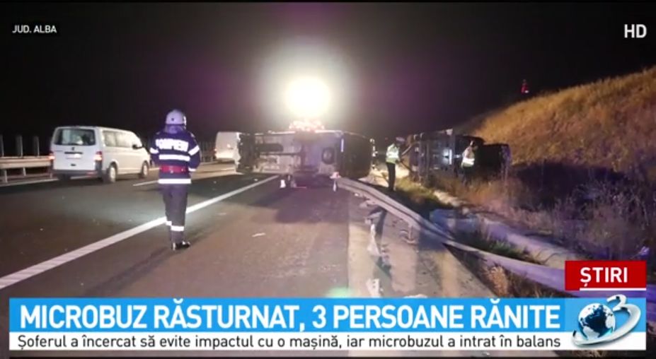 Un microbuz de pasageri care plecase dinjudețul Bacau spre Anglia s-a răsturnat, vineri seară, pe autostrada A1, în judeţul Alba.