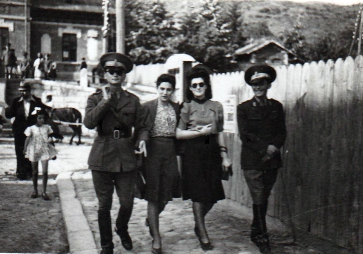 Această fotografie evocatoare, capturată în anul 1942, în plin război mondial, ne transportă în orașul Târgu Ocna, o localitate mică, dar plină de viață și de istorie din inima României. Imaginea surprinde patru persoane: două femei elegante și doi bărbați în uniforme militare, care par să se bucure de o scurtă perioadă de relaxare în mijlocul unei perioade tulburi.