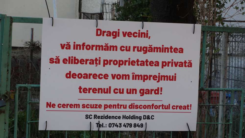Și asta pentru că, de câteva zile, cel care deține acel teren a postat o pancartă prin care îi înștiințează pe locatarii din zonă că trebuie să elibereze proprietatea private deoarece terenul va fi împrejmuit cu un gard. Problema e mai veche și s-a mai încercat cu ani în urmă să se construiască imobile pe acel teren.