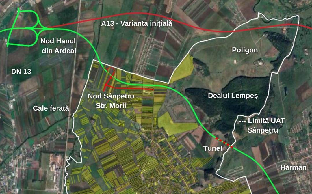 Primăria comunei Sânpetru a anunțat public noua variantă de traseu pentru autostrada A13 Brașov–Bacău, propusă de Compania Națională de Investiții Rutiere (CNIR). Modificarea vine ca urmare a imposibilității de a păstra traseul inițial, care ar fi interferat cu zona de protecție strictă a poligonului militar de testare drone Carfil – ROMARM.