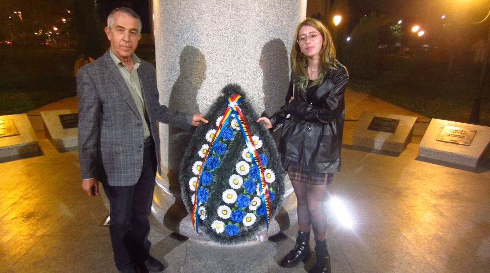 Împreună cu Irina-Elena Diţu, studentă la Literele băcăuane (originară din Caşin, la un pas de Mănăstirea-Caşin, unde Şcoala Gimnazială „Regina Maria” a marcat vineri centenarul încoronării), am depus la baza monumentului „România biruitoare” o coroană cu înscrisul „Centenarul încoronării. Omagiu!/ Societatea Cultural-Ştiinţifică «Vasile Alecsandri» Bacău”. Din păcate, singura coroană, de fapt singurul semn floral…