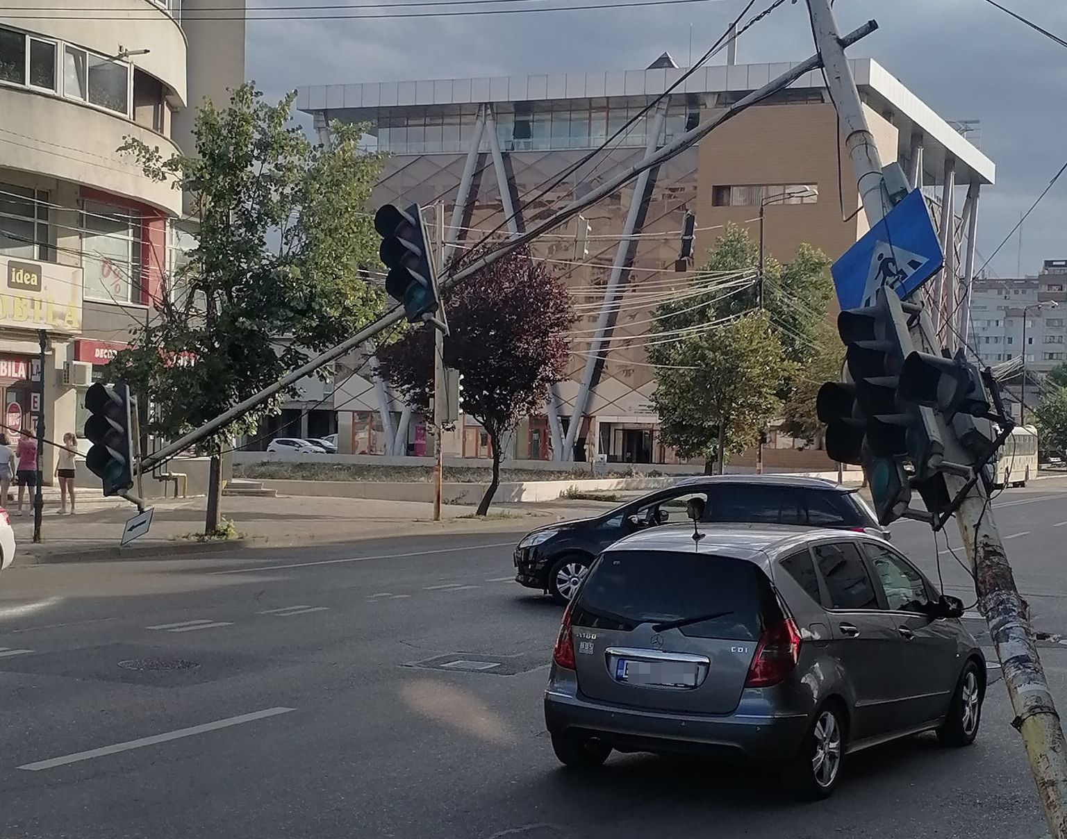 Un semafor a căzut, în urmă cu puțin timp, pe Bulevardul Unirii din Bacău, fiind susținut doar în câteva cabluri.