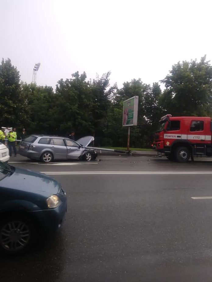 Un șofer a intrat cu mașina într-un stâlp pe care l-a dărâmat