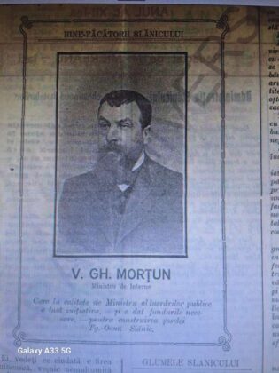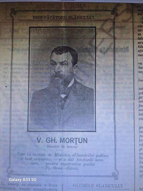 În semn de mulțumire și recunoștință, pe prima pagină a ziarului apar, periodic, fotografii ale celor care au contribuit la dezvoltarea stațiunii, grupate în tabloul ,,Binefăcătorii Slănicului”. În acest număr îl vedem pe Vasile G. Morțun, la acea dată ministru de Interne (prezentat într-unul dintre numerele anterioare), cel care, în calitate de ministru al Lucrărilor Publice între 1907-1910, așa cum se menționează în josul fotografiei, ,,a luat inițiativa și a dat fondurile necesare pentru construirea șoselei Tg.Ocna – Slănic-Moldova”, lucrare inaugurată la 27 iunie 1910, o dată cu noul stabiliment de inhalații și aer comprimat, numit ,,Inhalatorul”, instalație unică în țară la acea dată.