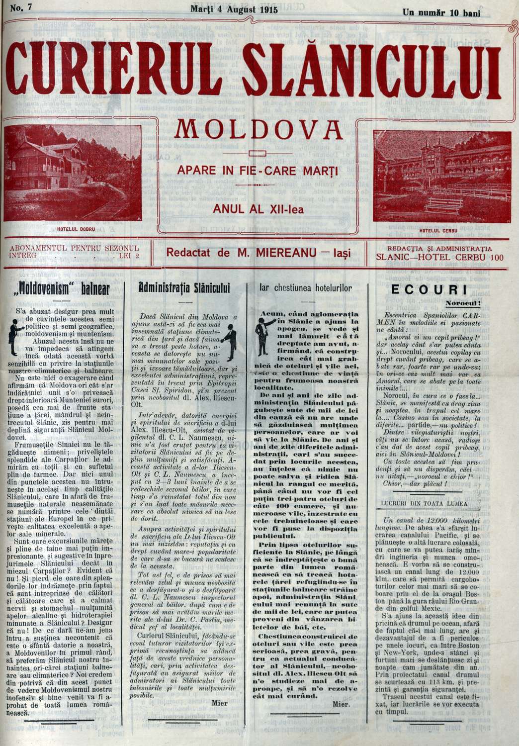 Continuăm prezentarea serialului dedicat ziarului ,,Curierul Slănicului-Moldova” (din colecțiile Bibliotecii Centrale Universitare ,,Mihai Eminescu” din Iași și Bibliotecii Centrale Universitare ,,Lucian Balga” din Cluj-Napoca), primul din România care a oglindit viața unei stațiuni balneare și a promovat-o în chip strălucit. În fapt, un jurnal al stațiunii Slănic-Moldova, care acoperă o perioadă istorică mai puțin cunoscută publicului larg, cea din perioada ,,La Belle Époque”; un model peste timp de promovare a turismului balnear al „Perlei Moldovei”, așa cum a fost denumită stațiunea pentru prima dată, chiar de către acest ziar.