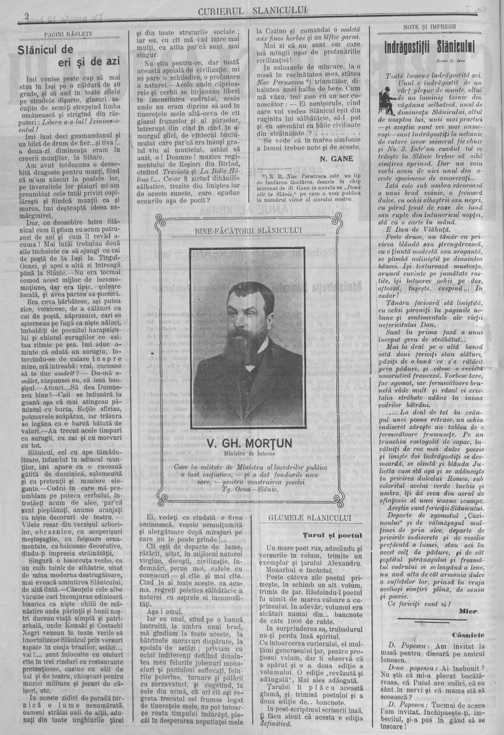 Printre cele câteva articole republicate și în acest număr al ziarului și prezentate la vremea lor, precum ,,`Moldovenism` balnear”, ,,Chestiunea hotelurilor”, sau minunata poveste ,,Îndrăgostiții Slănicului”, a lui M. Miereanu, se numără și cel intitulat ,,Slănicul de ieri și de azi”, reportaj semnat de scriitorul, junimistul, omul politic și academicianul, Nicolae Gane, personalitate complexă a culturii și politicii românești, asiduu vizitator al Slănicului-Moldova. Să nu uităm că domnia-sa, a dăruit stațiunii mai multe scrieri, printre care, nuvela ,,Două zile la Slănic”, dar și una dintre cele mai remarcabile povestiri cu subiecte vânătorești, publicată în premieră în paginile acestui ziar și intitulată ,,Catrințaș” (,,Curierul Slănicului”, Nr. 9, Joi, 15 iulie 1904), numele unui aprig pristav (păzitor/supraveghetor) al pădurilor din stațiune și ai cărui urmași trăiesc și astăzi, ei fiind și singura familie cu acest nume de pe întreaga vale a Slănicului…