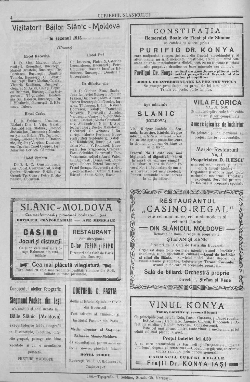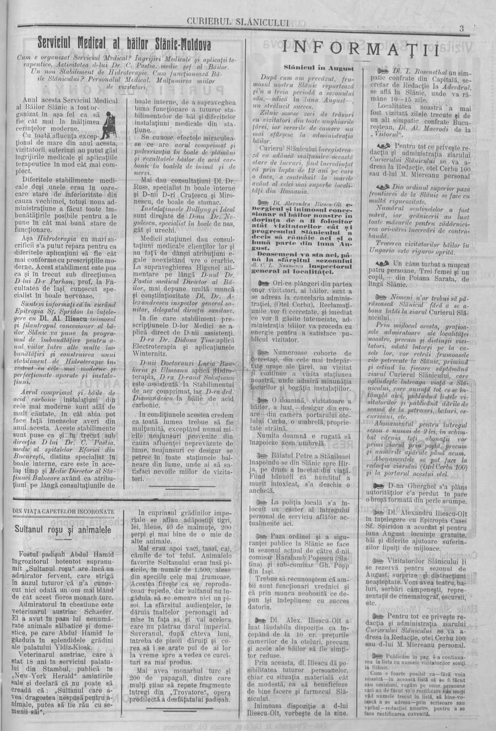 Iată că, avem în acest număr și noutăți despre Serviciul Medical al Slănicului-Moldova și anume: organizarea acestui serviciu, îngrijirile medicale și aplicațiile terapeutice, activitatea medicilor stațiunii, printre care, C. I. Parhon, Ludovic Russ junior și Constantin C. Pastia, acesta din urmă îndeplinind și funcția de director medical al stațiunii.