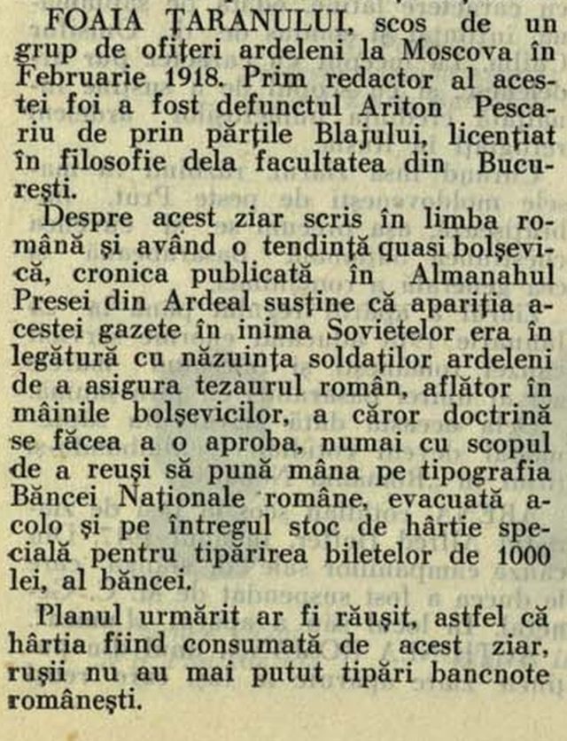 Almanahul dicţionar al presei din România şi a celei româneşti de pretutindeni (1926) ne prezintă o interesantă poveste a unui ziar aparent pro-bolșevic, tipărit de un grup de ofițeri ardeleni la Moscova în 1918.