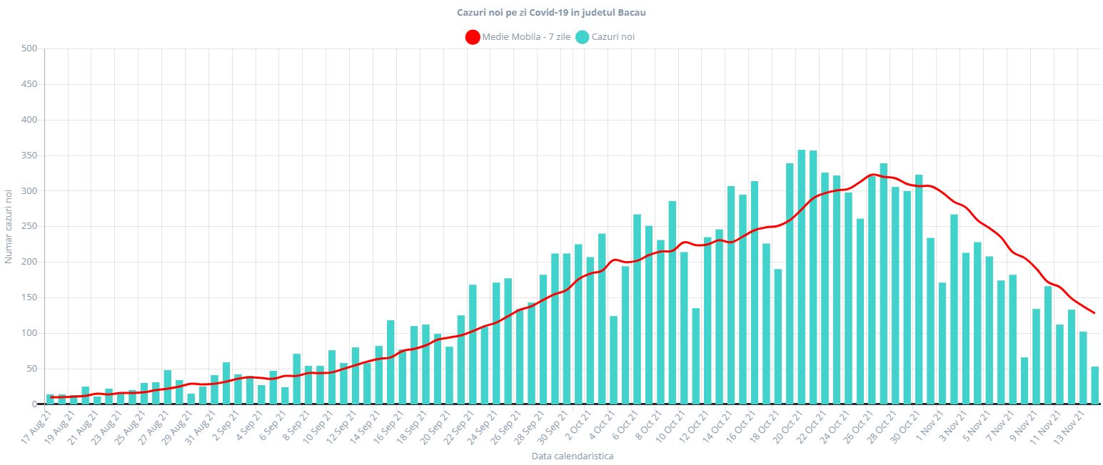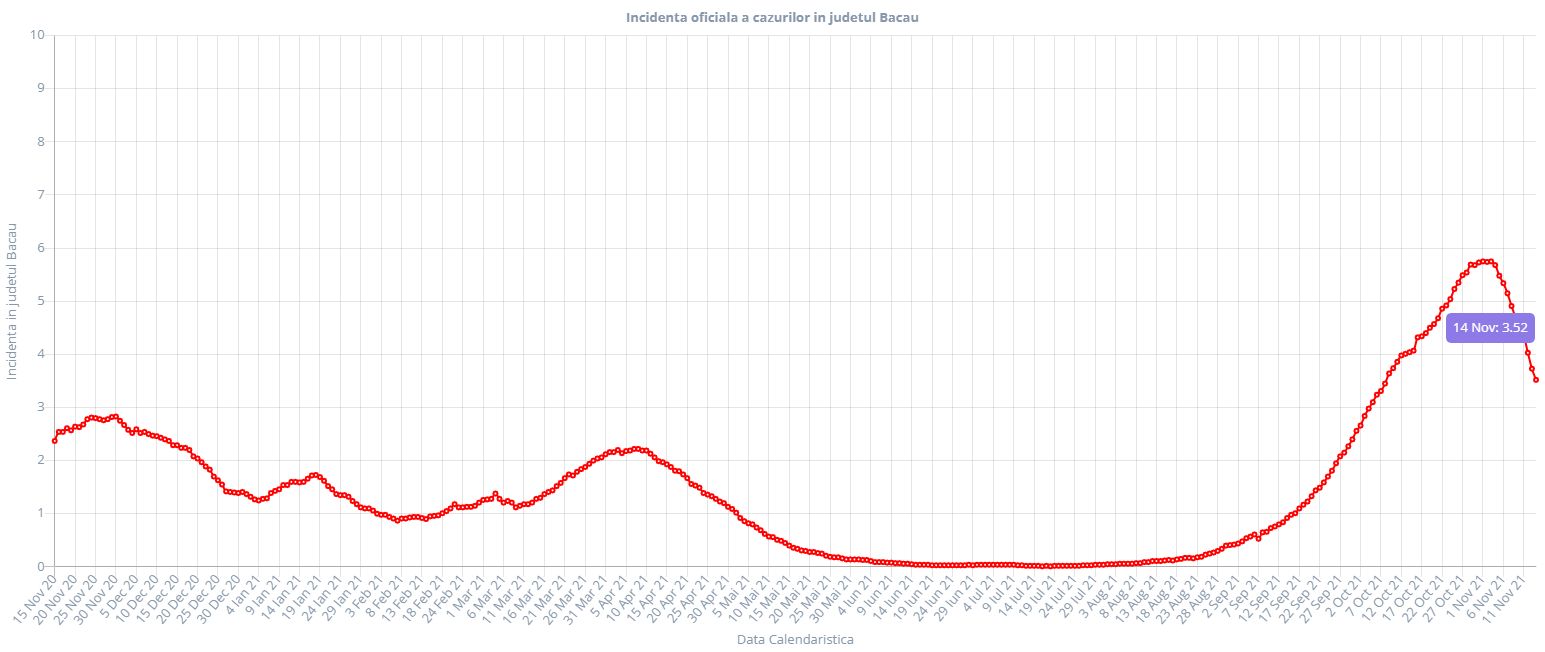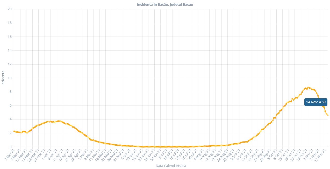 Conform datelor furnizate de Prefectura Bacău, județul avea o rată de incidență cumulată (RIC) la 14 zile de 3,23 la mie ( față de 3,52 la mie duminică), iar municipiul Bacău a avut RIC de 4,21 la mie (față de 4, 48 la mie duminică).