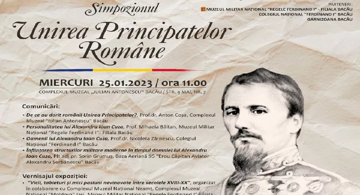 Complexul Muzeal „Iulian Antonescu” Bacău organizează miercuri, 25 ianuarie 2023, începând cu ora 11.00, simpozionul „Unirea Principatelor Române”. Cu acest prilej vor fi prezentate patru comunicări dedicate unui moment deosebit din istoria modernă a României, primul pas spre făurirea statului național unitar român.