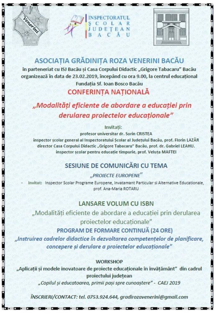 Sâmbătă, 23 februarie 2019, de la ora 9.00, la centrul educațional Fundația Sf. Ioan Bosco Bacău, va avea loc prelegerea ţinută de prof. univ. dr. Sorin Cristea cu titlul „Modalități eficiente de abordare a educației prin derularea proiectelor educaționale”.
