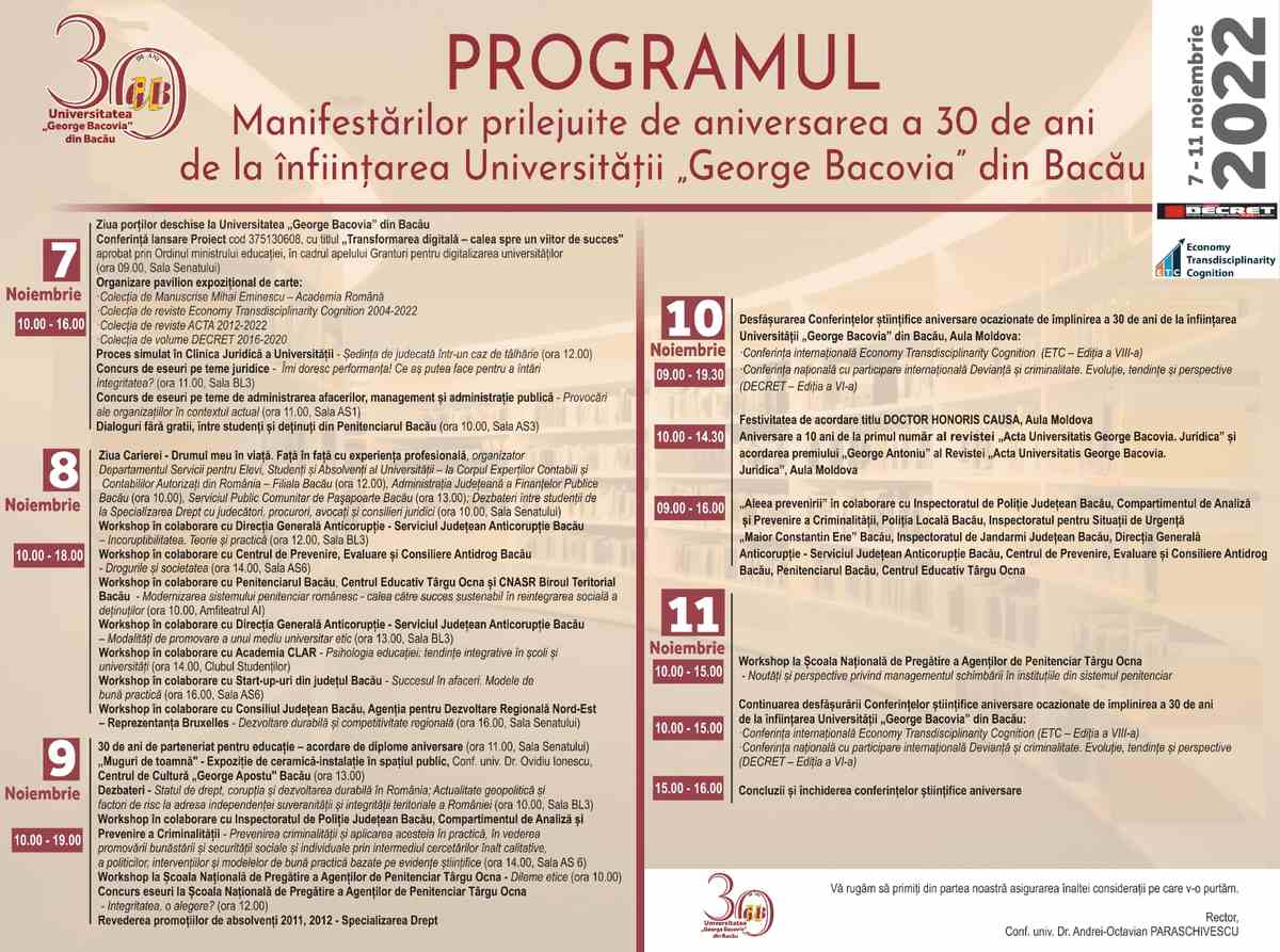 Manifestările debutează pe data de 7 noiembrie 2022 cu „Ziua porților deschise”, organizarea unui pavilion expozițional cu manuscrisele lui Mihai Eminescu și a revistelor științifice publicate în Editura Universității – evenimente care se adresează întregii comunități băcăuane, procese simulate în Clinica juridică dar și concursuri de eseuri ale studenților pe teme juridice, economice și administrative. Inedit va fi și evenimentul Dialoguri fără gratii, în cadrul căruia vor avea loc discuții între studenți și deținuți din Penitenciarul Bacău. De asemenea, în aceeași zi, va avea loc și Conferința de lansare a Proiectului Transformarea digitală – calea spre un viitor de succes, aprobat prin Ordin al ministrului educației, în cadrul apelului Granturi pentru digitalizarea universităților.