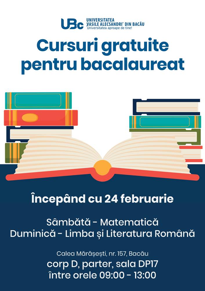 Universitatea „Vasile Alecsandri” din Bacău organizează cursuri de pregătire gratuite pentru Bacalaureat 2024 destinate elevilor din anii terminali. Pentru a veni în sprijinul acestora, profesori de prestigiu din cadrul Universităţii „Vasile Alecsandri” din Bacău vor parcurge programa şi subiectele pentru disciplinele Matematică și Limba şi literatura română.