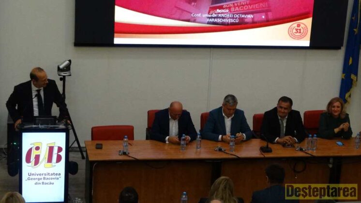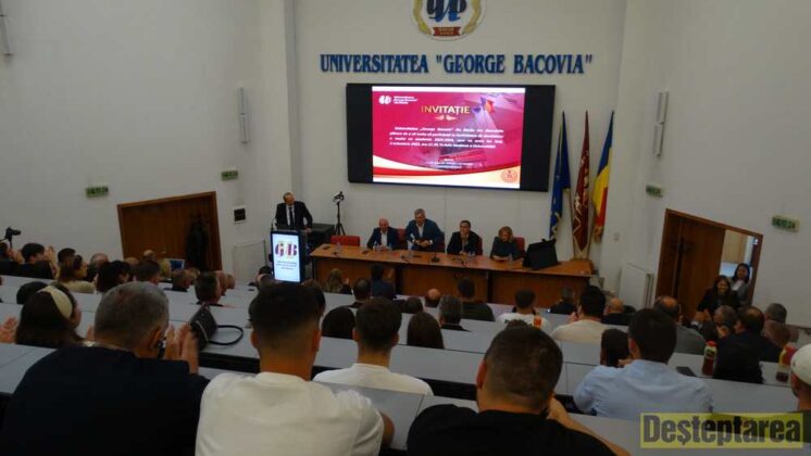 Și la Universitatea „George Bacovia” entuziasmul a fost la cote înalte. Aula Moldova a Universității a fost plină, invitați principali fiind prefectul Lucian Bogdănel, președintele CJ Bacău Valentin Ivancea, primarul Lucian Stanciu Viziteuși inspectorul școlar general prof. Ana-Maria Egarmin. Au fost prezente cadre didactice universitare, invitați speciali și studenți de la programele de licență și master ale universității.