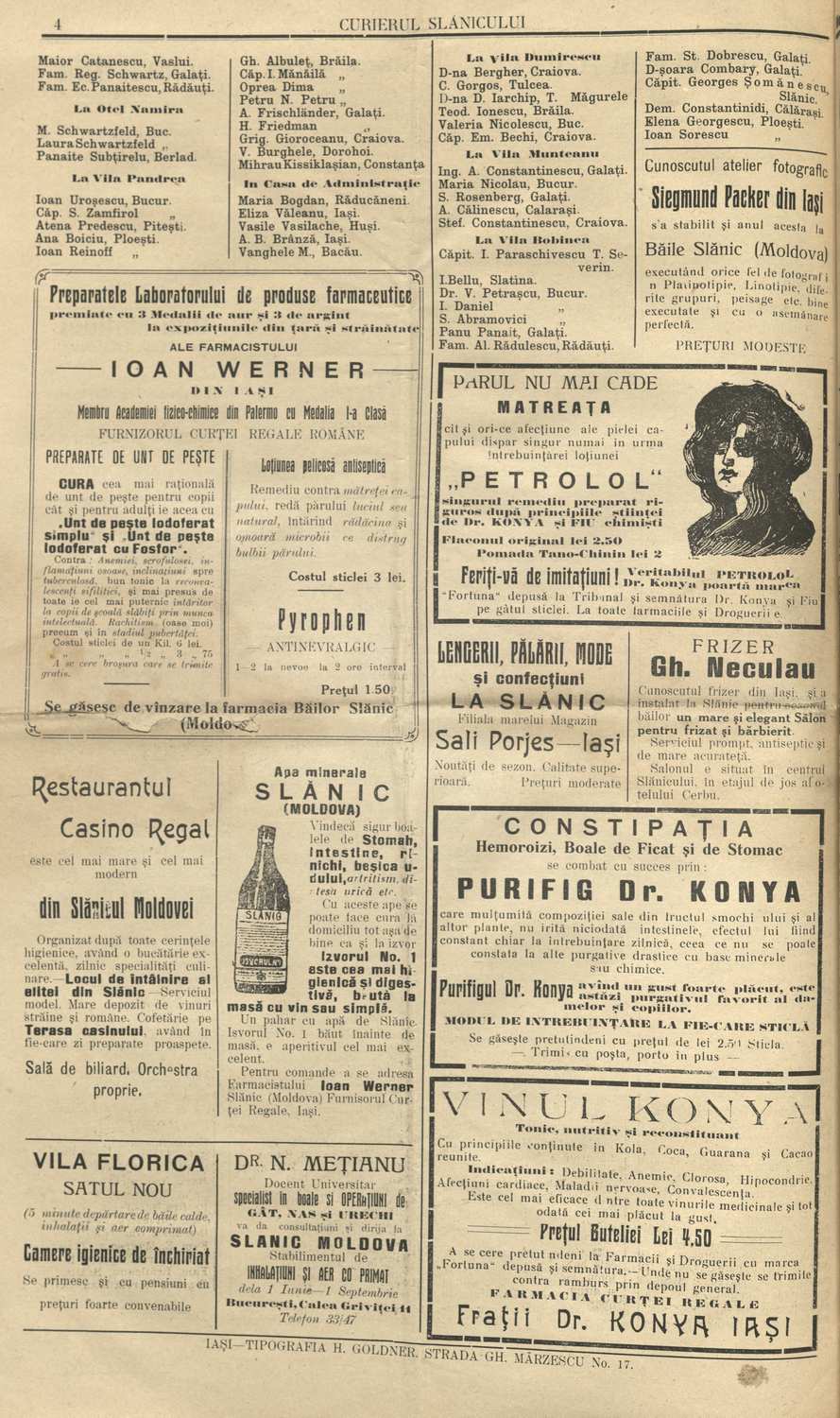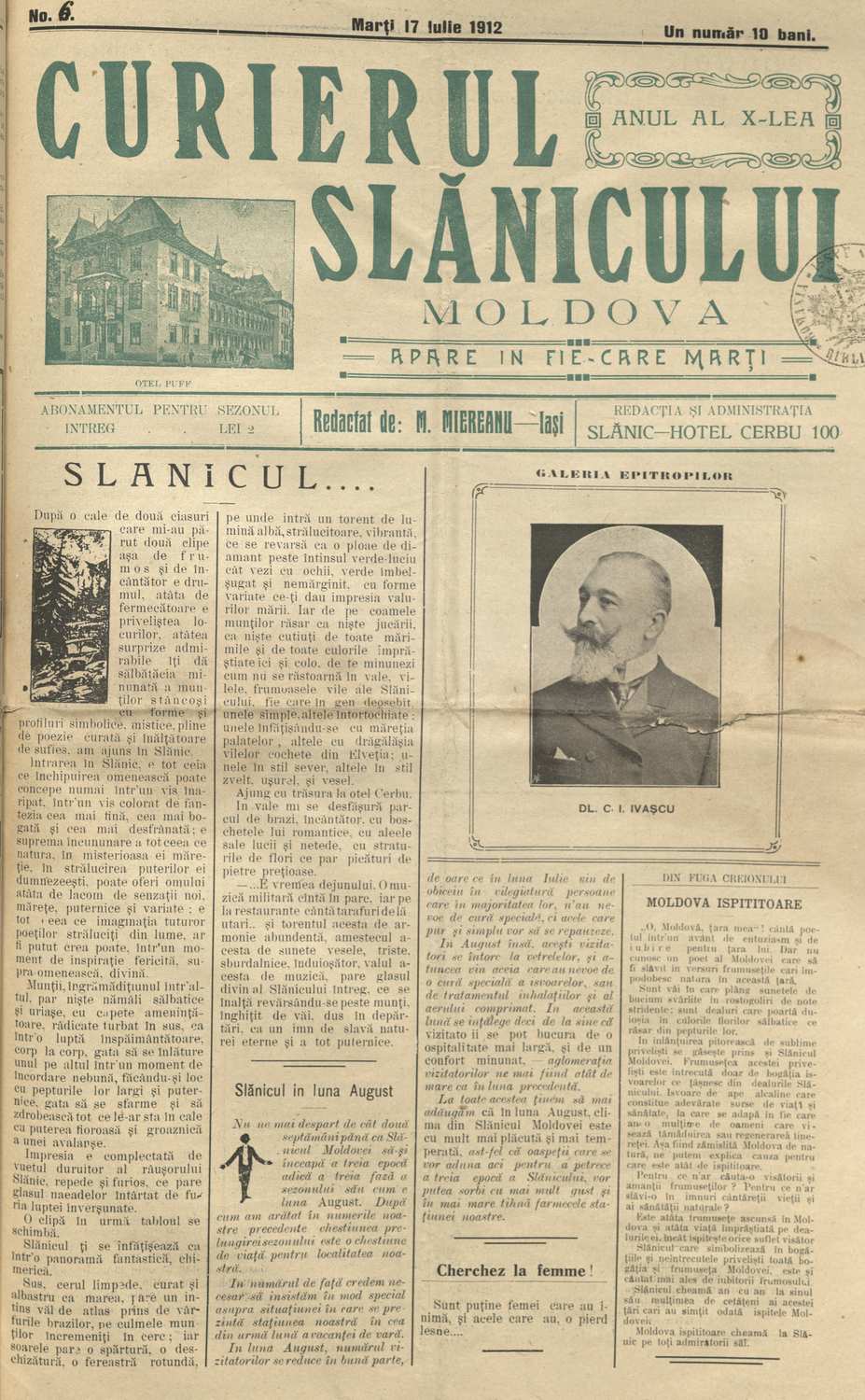Continuăm prezentarea serialului dedicat ziarului ,,Curierul Slănicului Moldova” (din colecțiile Bibliotecii Centrale Universitare ,,Mihai Eminescu” din Iași și Bibliotecii Centrale Universitare ,,Lucian Balga” din Cluj-Napoca), primul din România care a oglindit viața unei stațiuni balneare și a promovat-o în chip strălucit. În fapt, un jurnal al stațiunii Slănic-Moldova, care acoperă o perioadă istorică mai puțin cunoscută publicului larg, cea din perioada ,,La Belle Époque”; un model peste timp de promovare a turismului balnear al „Perlei Moldovei”, așa cum a fost denumită stațiunea pentru prima dată, chiar de către acest ziar.