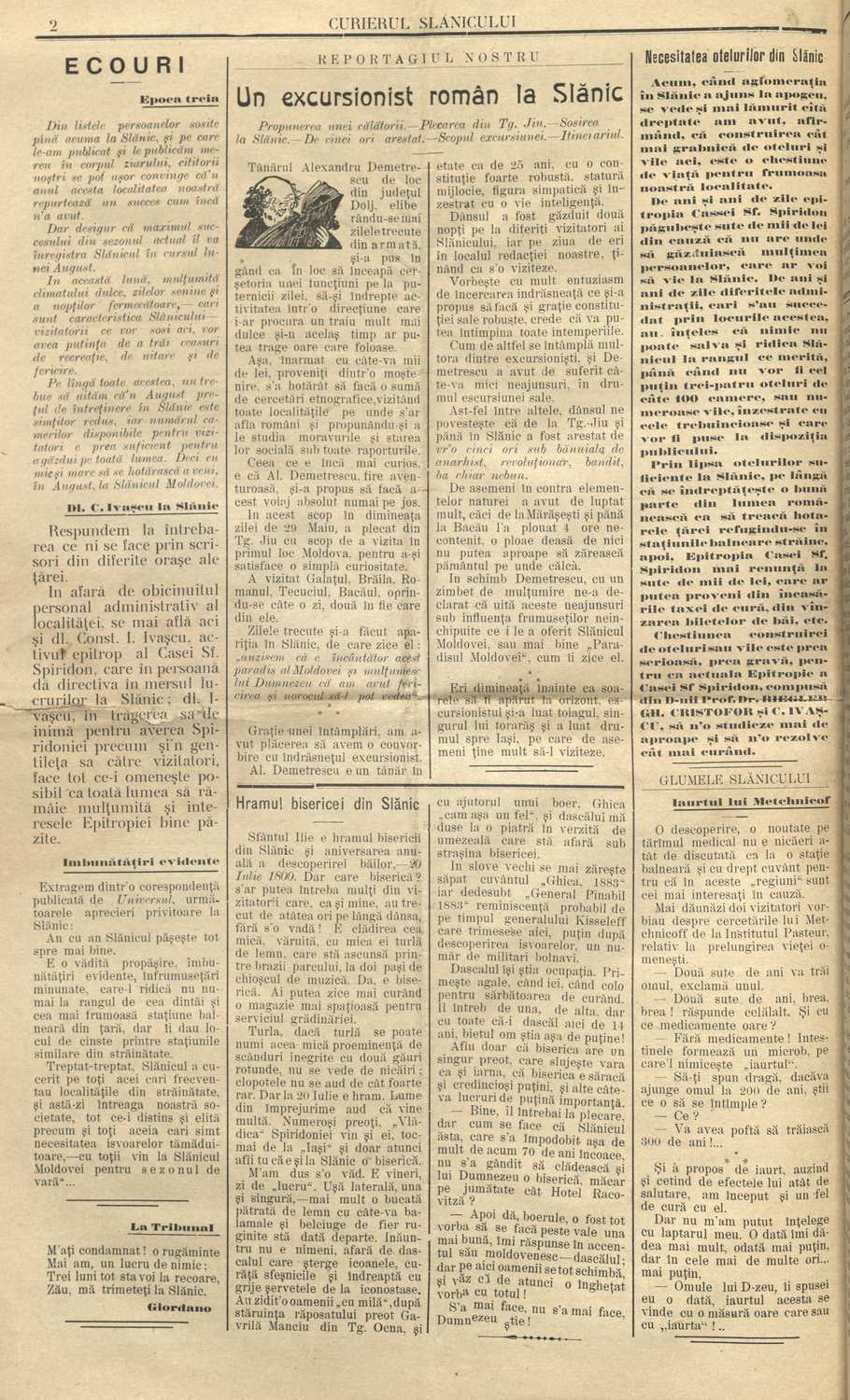 Este și cazul unui călător, de loc din județul Dolj, personajul principal al reportajului nostru: ,,Eliberându-se mai zilele trecute din armată, tânărul Alexandru Demetrescu și-a pus în gând ca în loc să înceapă cerșetoria unei funcții pe la puternicii zilei, să-și îndrepte activitatea într-o direcție, care i-ar procura un trai mult mai dulce și-n același timp ar putea trage oarece foloase. Așa, înarmat cu câteva mii de lei, proveniți dintr-o moștenire, Alexandru s-a hotărât să facă o sumă de cercetrări etnografice, vizitând toate localitățile pe unde s-ar afla români și propunându-și a le studia moravurile și starea lor socială sub toate raporturile. Ceea ce este însă și mai curios, este faptul că, Al. Demetrescu, fire aventuroasă, și-a propus să facă acest voiaj absolut numai pe jos”. Astfel, în data de 29 mai, tânărul nostru a purces la drum, tocmai din Târgu Jiu, cu scopul de a vizita în primul rând Moldova, și asta, pentru a-și satisfice pura curiozitate. A vizitat, pe rând, Galațiul, Brăila, Romanul, Tecuciul, Bacăul, poposind câte o zi, două, în fiecare dintre ele. În fine, ajunge și la Slănic-Moldova, despre care spunea: ,,Auzisem că e încântător acest paradis al Moldovei și mulțumesc lui Dumnezeu că am avut fericirea și norocul să-l pot vedea”. Alexandru a fost găzduit vreo două nopți pe la diferiți vizitatori ai Slănicului, iar într-o zi a ajuns și la redacția Curierului, ca să o viziteze și să schimbe impresii cu redactorul și reporterul de serviciu, M. Miereanu. ,,Al Demetrescu e un tânăr în etate de 25 de ani, cu o constituție foarte robustă, statură mijlocie, figură simpatică și înzestrat cu o vie inteligență. El vorbește cu mult entuziasm despre încercarea îndrăzneață pe care și-a propus să o ducă la bun sfârșit și, grație constituției sale robuste, crede că va putea trece peste toate intemperiile și solicitările unor astfel de călătorii”, este portretul pe care i-l creionează autorul reportajului. Acesta ne relatează în continuare și suferințele pe care le-a îndurat călătorul, până să ajungă în stațiune: ,,Printre altele, dânsul ne povestește că de la Târgu Jiu până la Slănic-Moldova a fost arestat de vreo cinci ori, cu bănuiala că ar fi anarhist, revoluționar, bandit, ba chiar nebun! De asemenea el s-a luptat și cu forțele naturii, căci de la Mărășești și până la Bacău a plouat patru ore necontenit, o ploaie densă de nici nu putea aproape să zărească pământul pe unde calcă. Și la final, Demetrescu, cu un zâmbet de mulțumire ne-a declarat că uită de toate aceste neajunsuri, sub influența frumuseților neînchipuite pe care i le-a oferit Slănicul Moldovei, sau mai bine zis, `Paradisul Moldovei`, așa cum a auzit el că i se spune și cum îi place și lui să-l numească. Ieri dimineață (întrucât ziarul a apărut în 17 iulie e posibil ca acest ieri dimineață să fi fost într-una din zilele săptămânii 9 – 13 iulie, n. a.), înainte ca soarele să fi apărut la orizont, excursionistul și-a luat toiagul, singurul lui tovarăș, după care a luat drumul spre Iași, pe care de asemenea, ține mult să-l viziteze”.