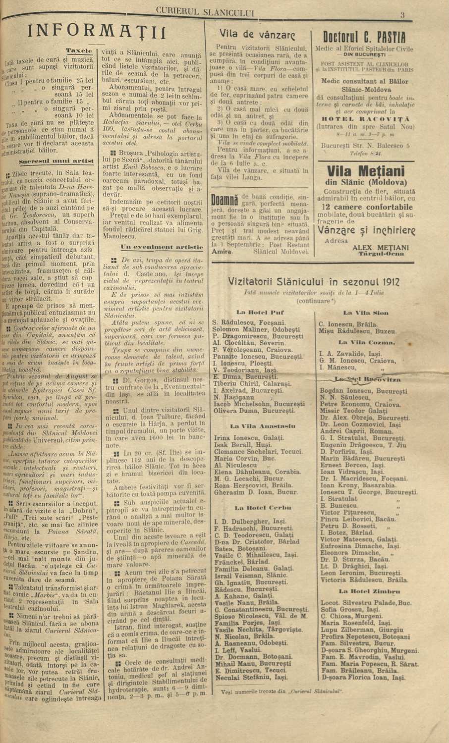 Ziarul ne informează și despre taxele de cură și muzică ,,la care sunt supuși vizitatorii Slănicului”: Clasa I, pentru o familie – 25 lei și pentru o singură persoană – 15 lei; Clasa a II-a, pentru o familie – 15 lei și pentru o singură persoană – 10 lei. Vizitatorii mai sunt înștiințați că taxa de cură nu se plătește de persoanele care stau mai mult de trei zile în stabilimentul băilor, dacă la sosire aceștia anunță administrația stațiunii.