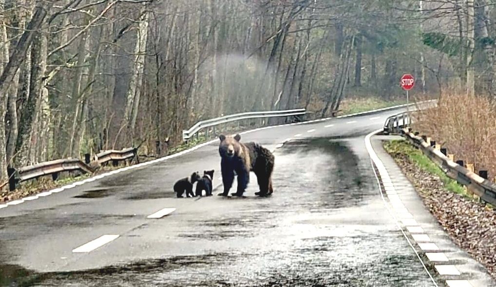 La câteva zile după ce a fost alungată de jandarmii montani, o ursoaică și cei doi pui ai săi au revenit în stațiunea Slănic Moldova. Ea a fost fotografiată, astăzi, în jurul orei 14.30, după izvoare.