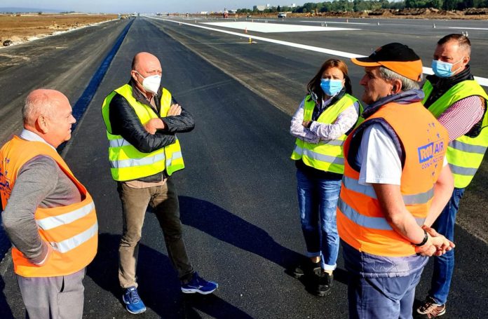 Ploile abundente din ultima perioadă au îngreunat marcajele de la noua pistă a aeroportului. În ciuda condițiilor meteo nefavorabile, proiectul este în grafic, iar procedura de autorizare de către Autoritatea Aeronautică e în plină desfășurare.