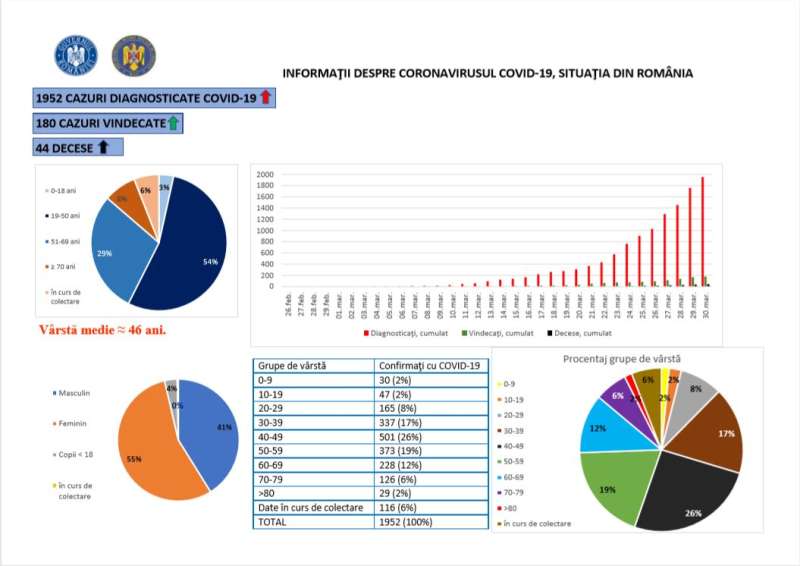 Conform Departamentului pentru Situaţii de Urgenţă, dintre cele 1.952 de cazuri diagnosticate, 180 au fost vindecate. S-au înregistrat 44 de decese AGERPRES