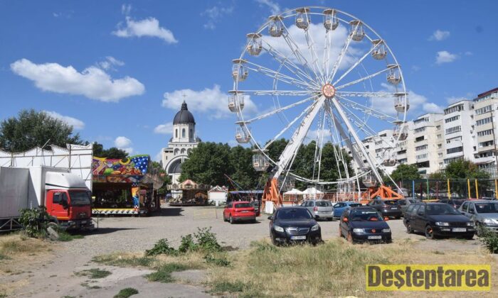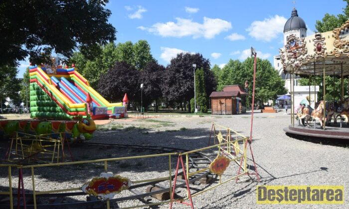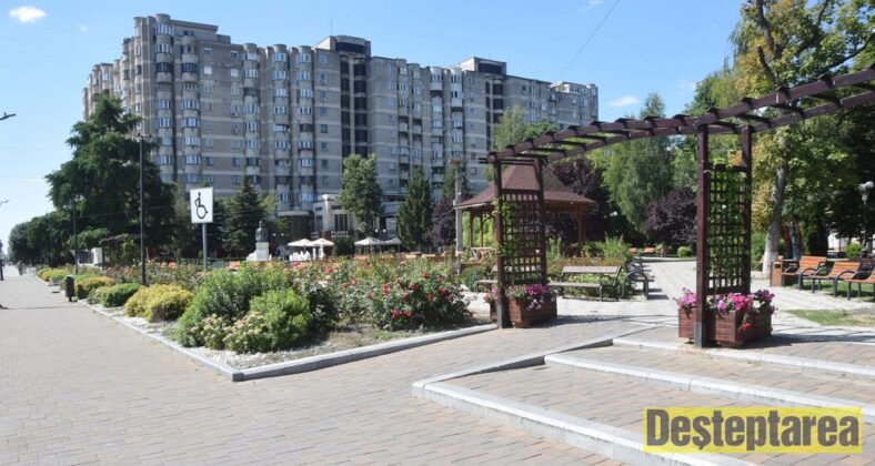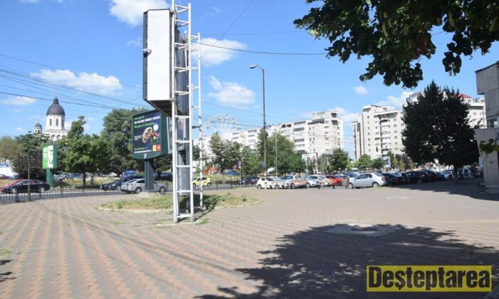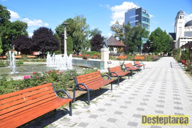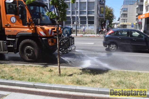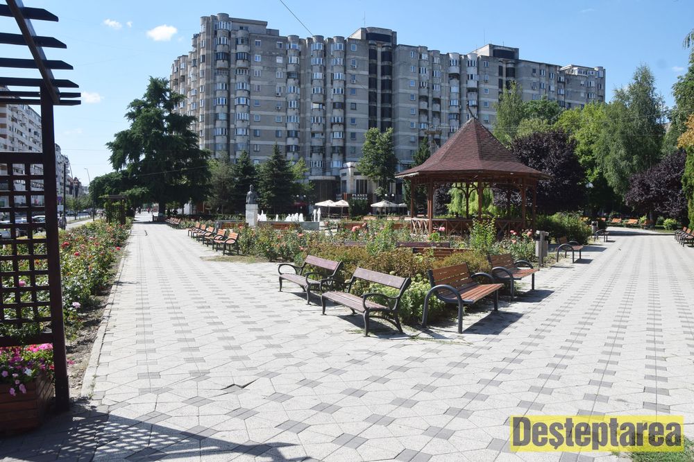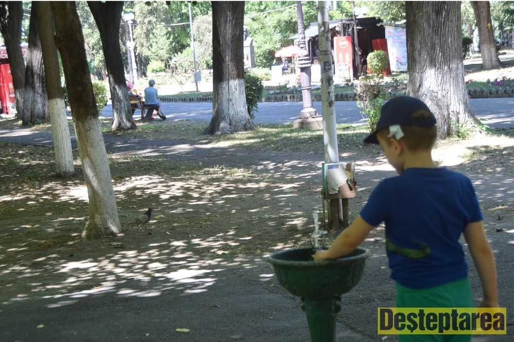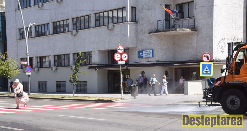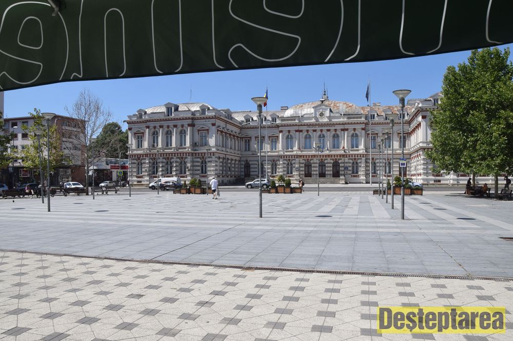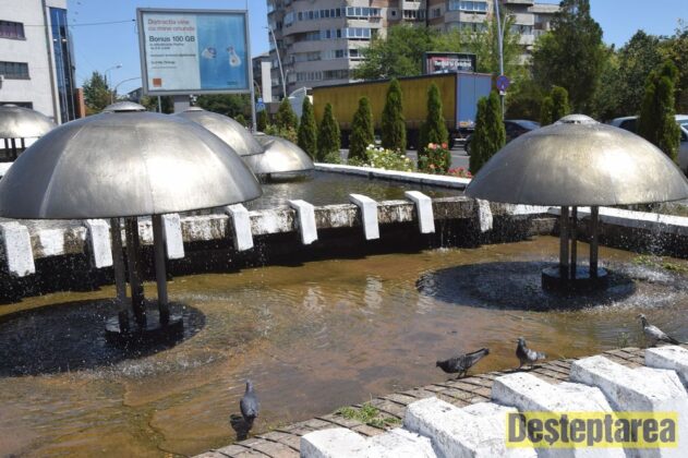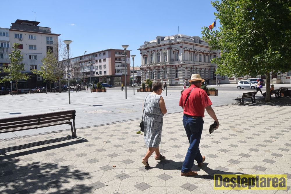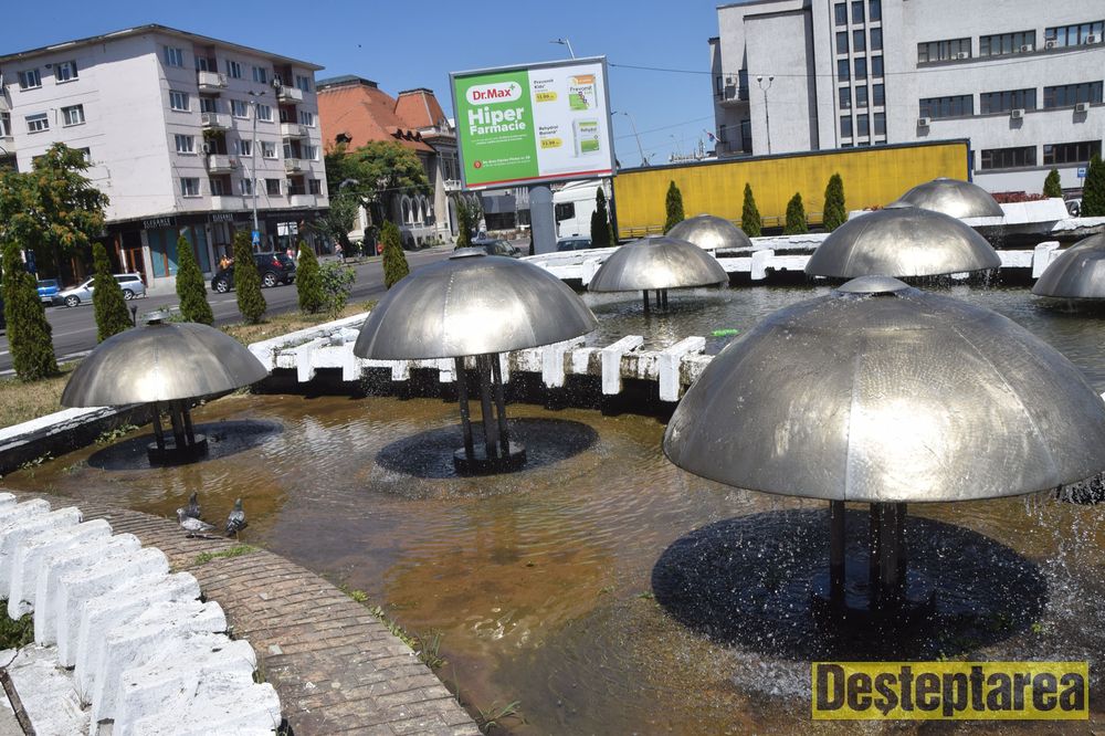 Piațeta din fața Prefecturii ne aduce aminte că e secetă. Noroc că o mașină, a primăriei, mai stropește și perie astfaltul. Țâșnitorile nu mai țâșnesc, așa cum nici Casa de Cultură nu mai este ce era. Măcar acolo te poți opri la o bere, pe tersă. Mai spre Policlinica Veche, „Ciupercuțele” fac și ele baie cu porumbeii.