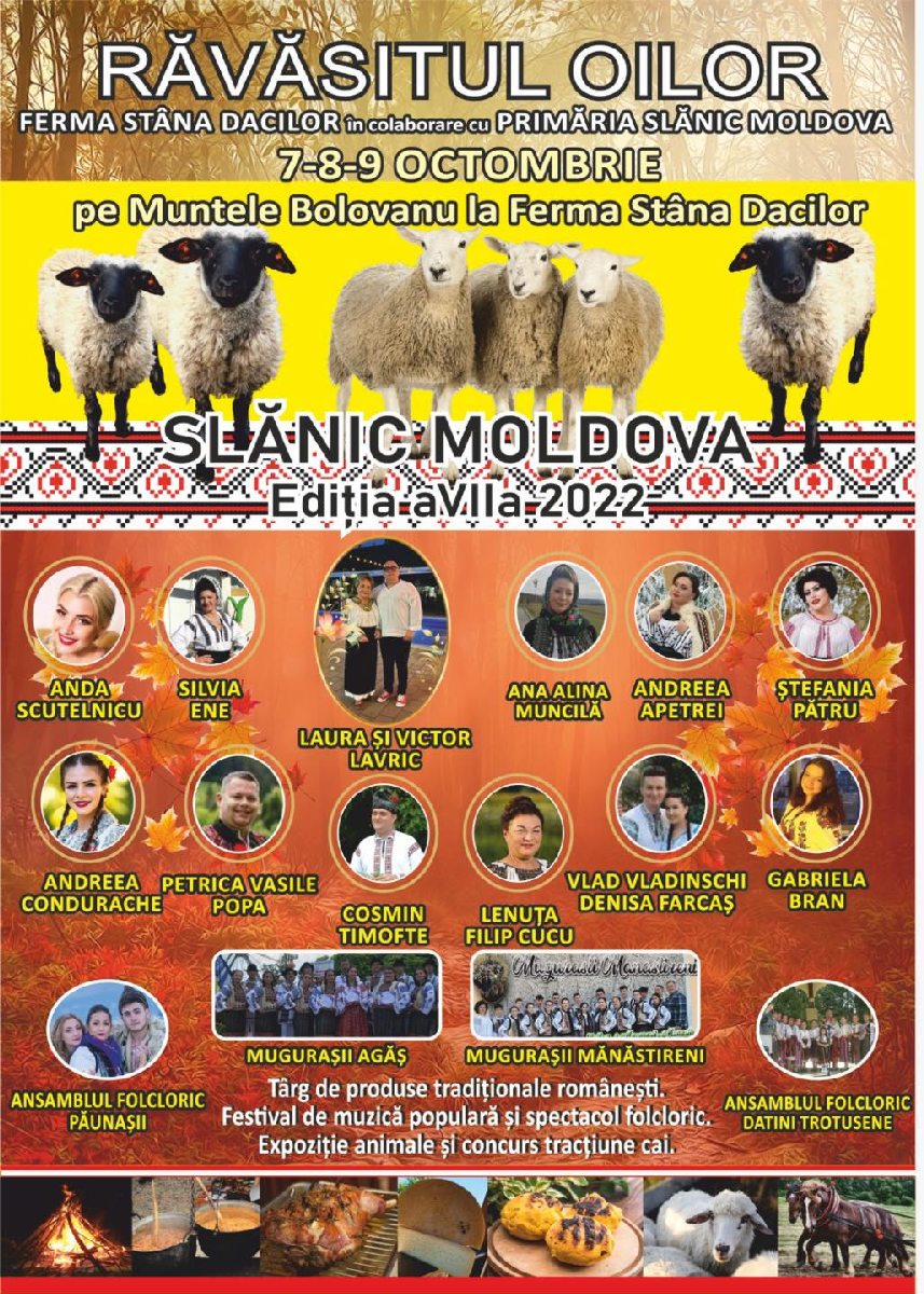 La Ferma ,,Stâna Dacilor” din stațiunea Slănic-Moldova (Muntele ,,Bolovanu”), are loc, între 7 – 9 octombrie, cel mai important eveniment pastoral al toamnei băcăuane: Festivalul ,,Răvășitul Oilor”.