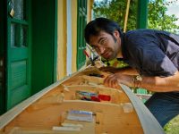 In paranteza fie spus, la finalizare, caiacul a cântarit doar circa 20 de kilograme. Lemnul i-a urmat intocmai proiectul si s-a asezat cuminte in forma dorita, predominant curbata. Adezivul pentru lemn si apoi fibra de sticla au consolidat tot ce lucrase: o ambarcatiune perfect flotanta, rezistenta si prezentabila.
