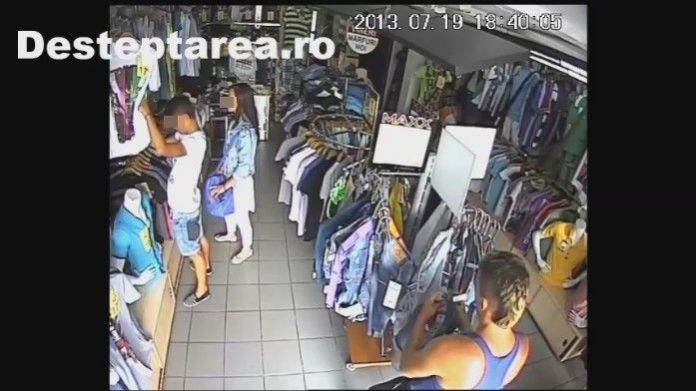 Camera de supraveghere dintr-un magazin situat in zona centrala a Bacaului, chiar peste drum de Primarie, a surprins un tanar care impacheteaza fara probleme o pereche de blugi scurti apoi baga pantalonii sub maieu.